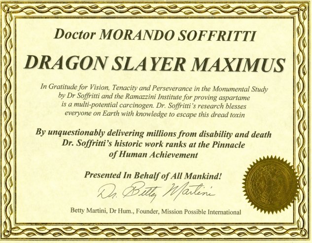 Award presented to Dr. Morando Soffritti of The Romazzini Institute (Italy) by Mission Possible International for his scientific work in exposing the dangers of aspartame.