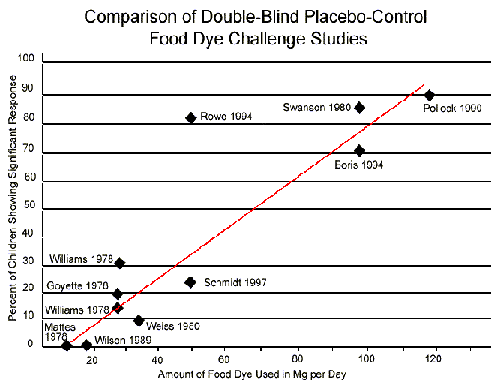 Early studies, therefore, used unrealistically small amounts of coloring and most ignored the thousands of flavoring chemicals and the petroleum-based preservatives altogether -nevertheless when all studies are seen together, the results are clear. Whether the study used a Feingold-type diet or an oligoantigenic (few foods) diet, about 70% to 80% of children improved. When these improved children were then challenged by some amount of food coloring, how many reacted varied directly with the amount of coloring used. See Graph #1 below.