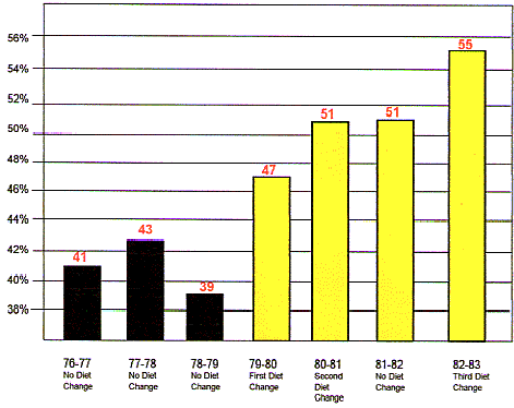 "Before the diet change, very little change occurred in mean academic percentile rank for the 803 schools. The average fell just less than 1% per year . . . The only year with a gain was 1977-78 and that was limited to 1.7%. The mean national performance rankings of the 803 public schools stood at 39.2% in the spring of 1979.